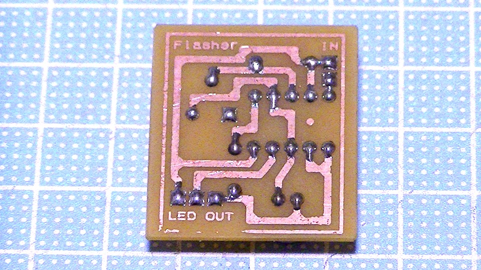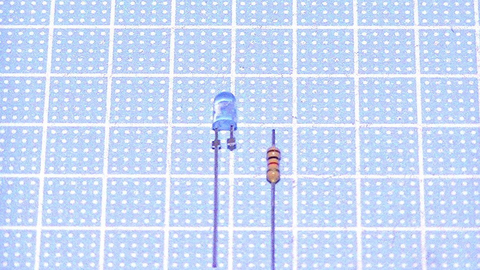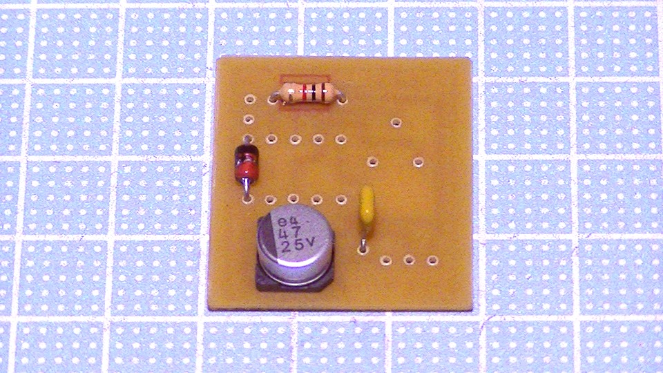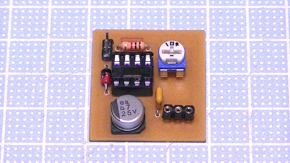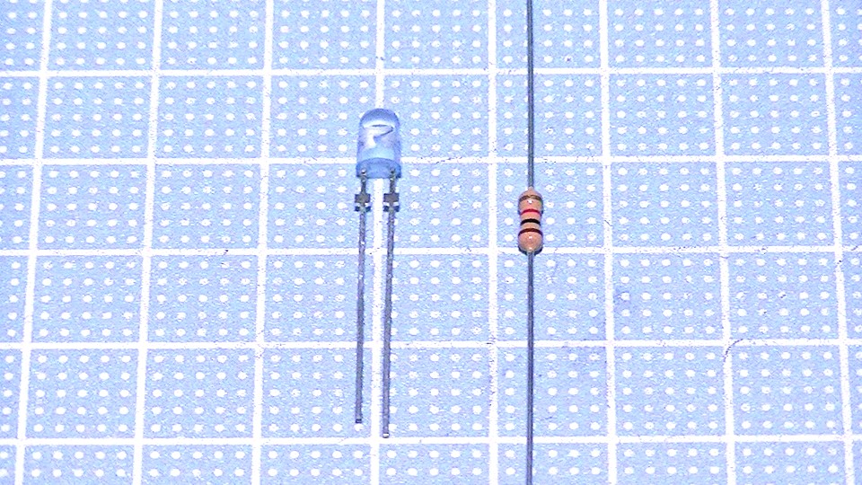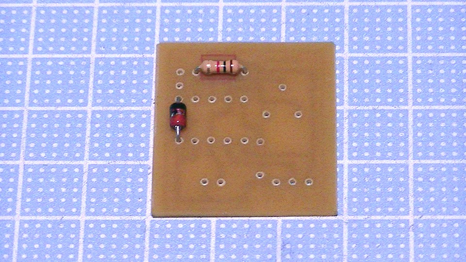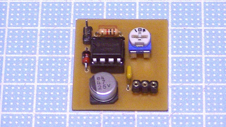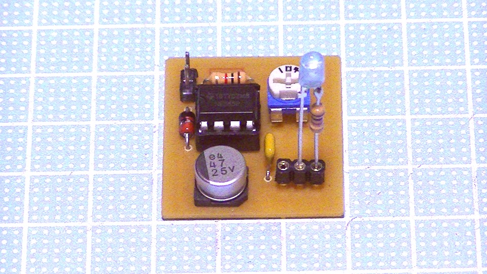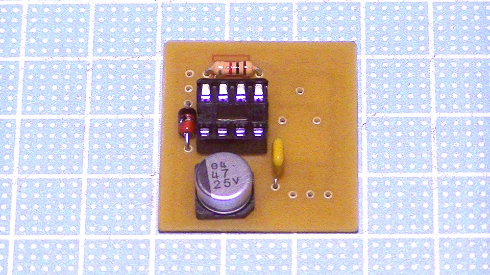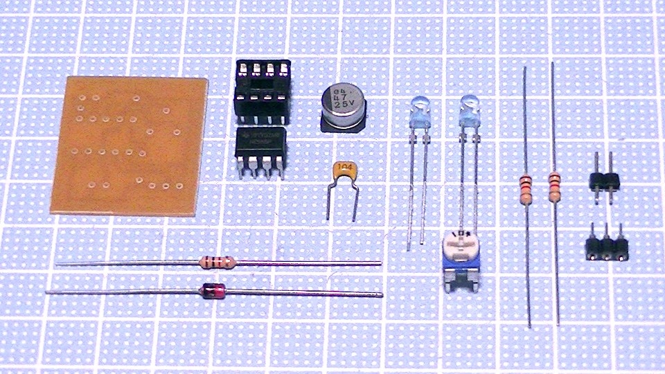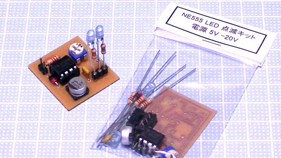 タイマーIC555を使ったLED点滅回路です。 電源用乾電池・電池ホルダー:配線は、別途ご用意してください。 自動車用には、配線のご用意をお願いします。 パーツ一式 -------------------------------------------- さぁ、作ってみましょう。 回路製作の手順は、背の低い部品から順番に取り付けていきます。 最初は、抵抗と逆電圧防止用のダイオードを取り付けます。 コンデンサー2種類を取り付けます。 ICマウントの取り付けです。 最後にVR(可変抵抗)と端子を取り付けます。 ハンダ付けはランド(部品の接続位置)にしっかりとハンダ付けしてください。 最後にICの取り付けです。 --------------------------------------------- LEDの足に抵抗を取り付けます。 LEDの長い方の足を1cmほど残してカットします。 カットしたそれぞれの足をハンダ付けします。 LEDの光る部分の内部の金属の形状も覚えて置きましょう。 LEDを画像のようにソケットへ差し込んで電源をつなげば光り点滅を始めます。 LEDを交互点滅させるには、上の画像のようなLEDを作ります。 ソケットの1番が−端子・3番が+端子です。 1番と2番が消えるときは、2番が−になっているときで、−と−で入力0Vです。 2番と3番が消えるときは、2番が+になっているときで、+と+で入力0Vですね。